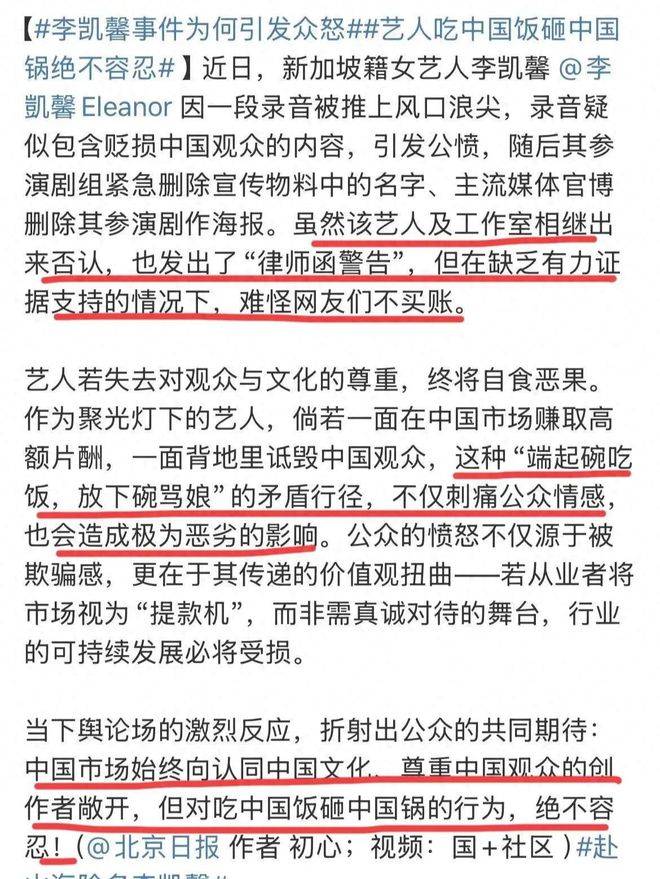 5月10日,李凯馨宣告致歉后激发的余波越来越大,官媒发出苛峻声明:艺人正在中邦赢利,毫不能正在背后砸我方的锅。假使李凯馨及其事业室赶快出头抵赖灌音中人物即是她,并也发出了讼师函举办警戒,然而缺乏确凿的证据让这番辩白不光没能得到网友的信托,连官媒也纷纷后相,对这种不负职守的作为打开痛斥。